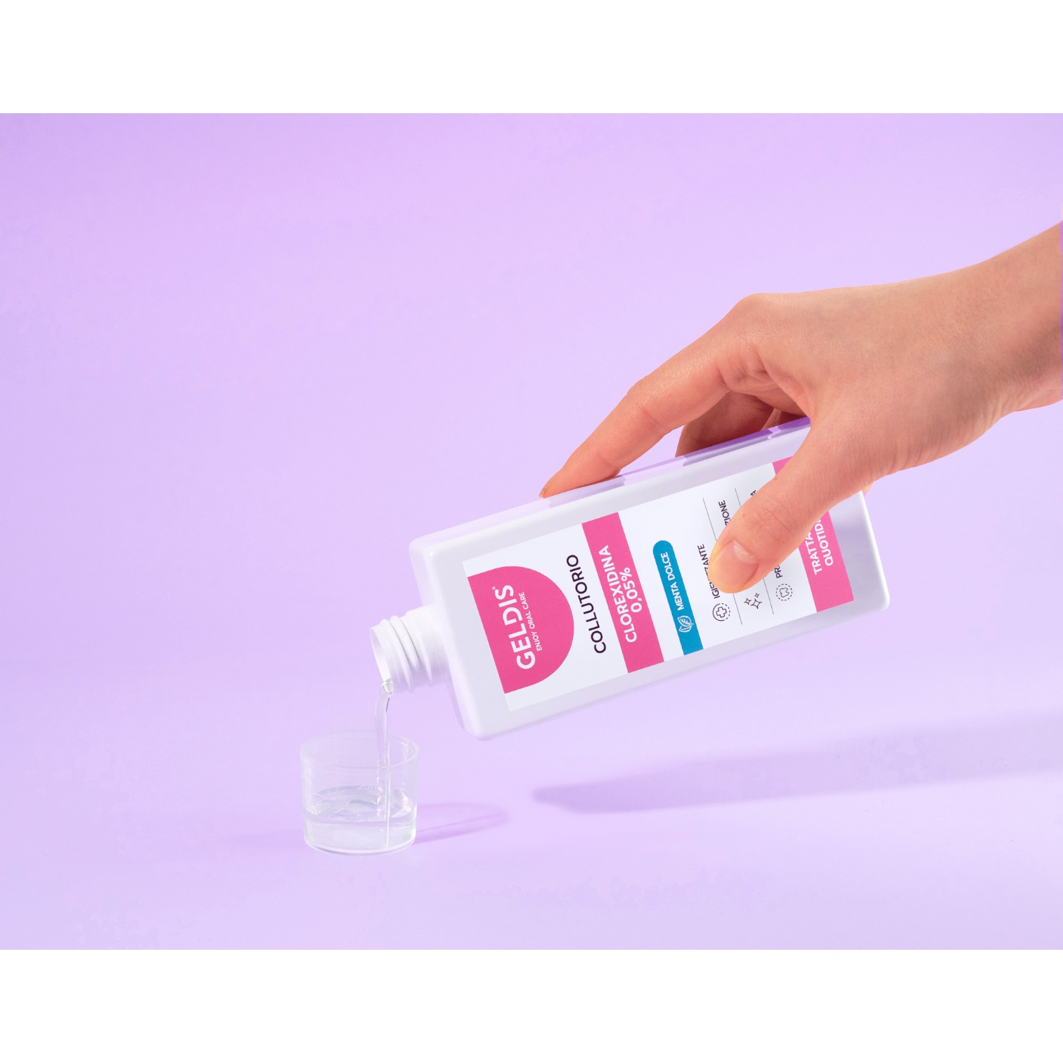 Płyn do płukania jamy ustnej z chlorheksydyną 0,05% Geldis zapobiega powstawaniu i gromadzeniu się płytki nazębnej oraz utrzymuje dziąsła w dobrej kondycji. Pomaga w utrzymaniu najlepszych warunków higienicznych nawet w przypadku wrażliwych dziąseł, stałych aparatów ortodontycznych, protez i implantów.